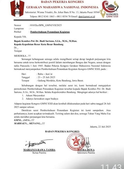 Ketua DPD GMNI Banten, Indra mengatakan, “rupanya Badan Pekerja Kongres diam-diam berkoordinasi dengan Polrestabes Bandung untuk menunda kegiatan Kongres XXII GMNI dalam 3 hari ini. Kita baru liat juga dan kaget banget, ada surat Pemberitahuan Penundaan Kegiatan ini. Padahal kita, delegasi dari DPC dan DPD GMNI se-Indonesia, tidak diberikan informasi apa-apa dan dibikin menunggu tanpa kejelasan. Ini berarti Badan Pekerja Kongres dan Panitia Lokal sengaja menelantarkan kita”.
