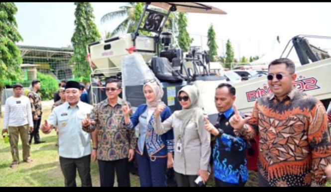 Penyerahan combine harvester dan uji coba alat mesin pertanian di lahan petani.