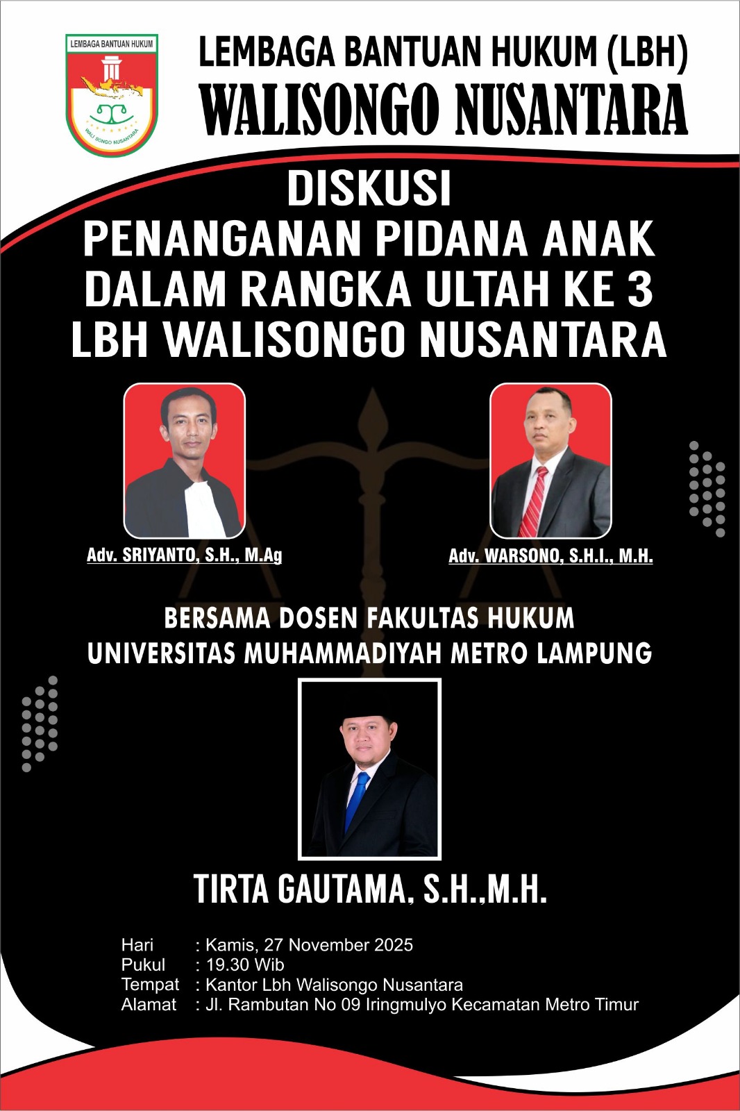 Awan News, Metro – Memperingati tahun ke-3, Lembaga Bantuan Hukum (LBH) Wali Songo Nusantara menggelar diskusi publik bertema Penanganan Pidana Anak, Kamis malam (27/11/2025), di Kantor LBH Wali Songo Nusantara, Jalan Rambutan Nomor 09, Iringmulyo, Kecamatan Metro Timur.